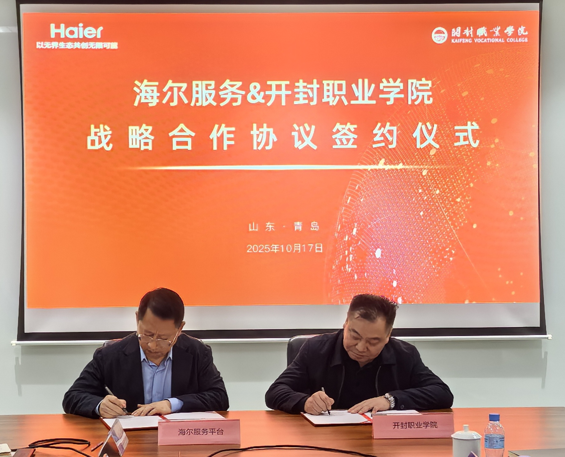 在与会人员的共同见证下,徐仲昆与刘建军签署双方战略合作协议,并共同为“开封职业学院实习实训基地”揭牌。根据协议,双方将共同投入在开封职业学院建设“海尔智家产教融合基地”,面向在校生和社会人员协同开展订单培养和定制化教学,打造能力强、意识强的海尔服务工程师。